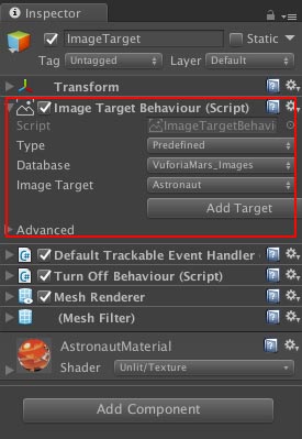 ImageTarget 遊戲物件能夠在運行時做為追蹤圖像目標,主要是因為它具有 ImageTargetBehaviour 這個組件。